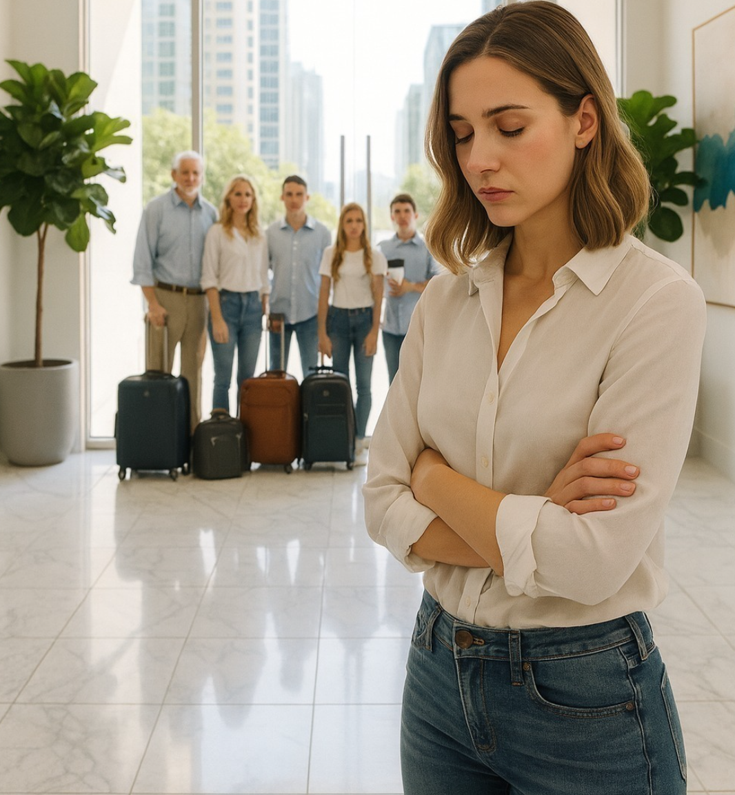 Afuera estaba toda la familia de mi esposo: su madre, sus dos hermanas menores, su hermano menor y la esposa de su hermano. Todos llevaban bolsas y maletas, con una sonrisa de oreja a oreja.